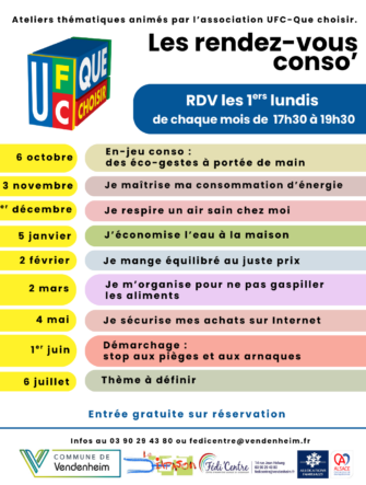 Les bénévoles de l’association UFC-Que choisir vous proposent des ateliers thématiques pour vous aider à acquérir les bons réflexes dans le domaine de la consommation. Vous pourrez obtenir de précieux conseils sur la consommation responsable, l’alimentation ou encore comment éviter les pièges et anarques commerciales.